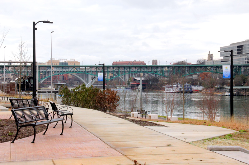 the park walkway and the bridge going over to the city.