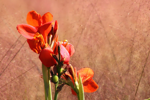Love the grass that grows a topper that looks like smoke from a distance. The ones here were a pretty pink. I also love tropical flowers---they love the hot weather here, too.